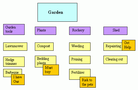 Using different shaped or coloured ‘header’ cards to make them more striking is helpful. The semi-sticky adhesive used on re-stickable notes is available in spray-can form, so if you want to use non-sticky cards, you can make a re-stickable display area by spraying flip-chart paper with the adhesive; the cards can then be put in position or removed and rearranged as you wish. One possible approach is as follows: