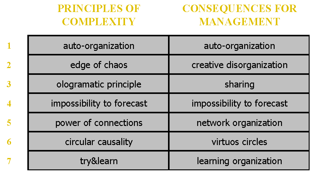 Since theory of complexity is a multidisciplinary science, literary contributions are numerous and heterogeneous. Therefore, we tried to rationalize this huge field by identifying seven principles of theory of complexity and seven consequent principles for firms (fig.2; source: De Toni and Comello, 2004), that can be considered complex adaptive systems too.
