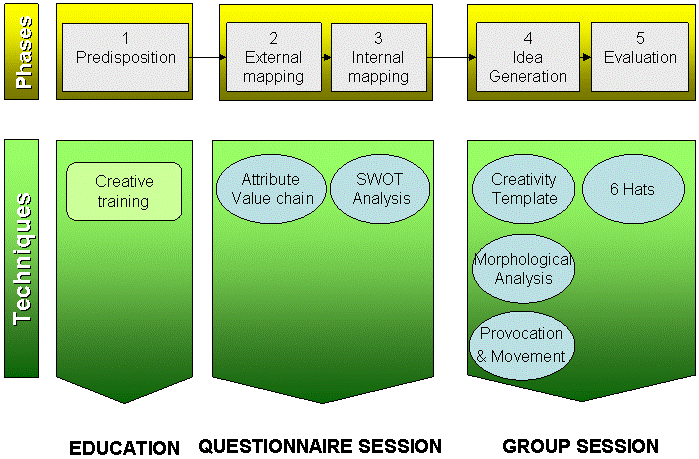 Fig.5 - Phases and techniques for creativity enhancement in firms (De Toni, Sanfilippo and Comello, 2004).