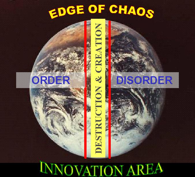 The principle of theory of complexity that underlines the importance of creativity for every complex adaptive system is the one about the edge of chaos. Evolution takes CAS to that area between order and disorder called by complexity scholars edge of chaos (Waldrop, 1992). It is the only place where life can take place. Too much order causes death by ossification, too much disorder causes death by disintegration. According to Cohen (1997, p.69): "At the edge of chaos, the borders of change continuously flow between a stagnant status quo and the anarchy of endless destruction". Thus, edge of chaos is a dangerous place to be visited. It isn't order nor disorder. It is between order and disorder. It is a place of creation, but it can be even a place of destruction.